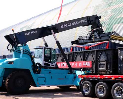 領(lǐng)導(dǎo)們在現(xiàn)場進行了合影留念,并與在場的全體職工一起觀摩了集裝箱起吊過程。