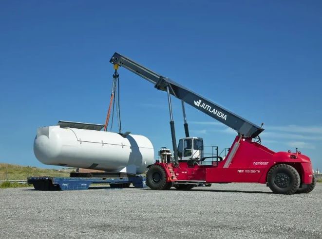 風電塔筒一節的重量在數十噸到上百噸不等。科尼正面吊配備起重機吊鉤,可將60-80噸的重物提升至15m高,而兩臺正面吊聯合作業可以處理120-160噸的龐大組件,可在小范圍內實現靈活搬運。